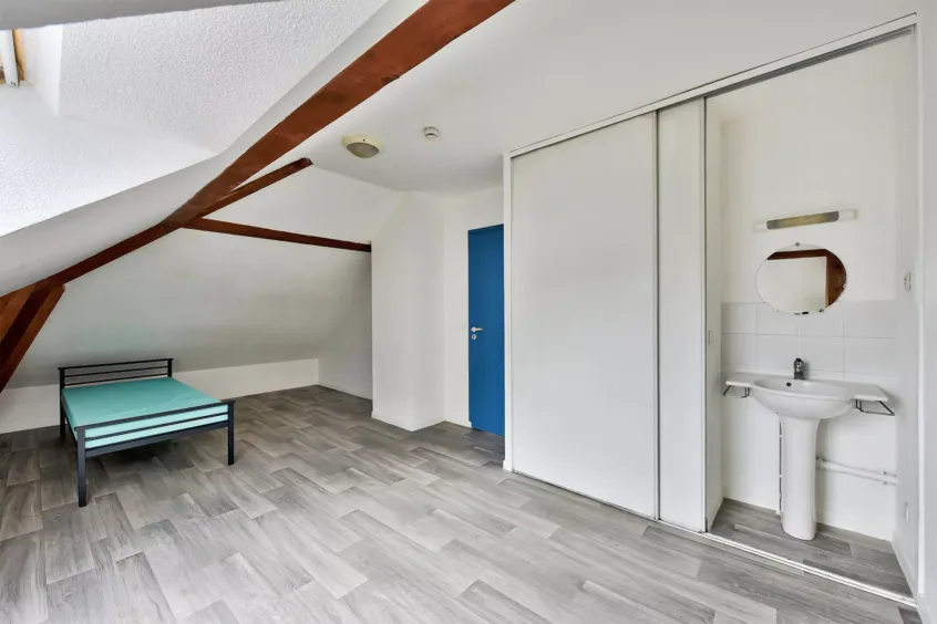 Le logement est équipé d’une kitchenette collective avec une plaque de cuisson, d’une table et de chaises, d’une salle de bain avec wc commun et d’un accès internet
